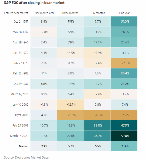 Looking at the markets a little more broadly, on average, one year after entering into a bear market (a market that has declined by 20% or more from peak to trough) markets return 23.9% over the next 12 months.