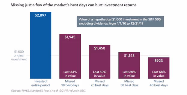 So, we know that if history is our guide, we likely have a nice market return coming, perhaps even over the next 12 months. But can we avoid the pain we are facing today? Unfortunately not, or at least not if we want to be a successful investor going forward and for the long term. I mentioned that markets like this are predatory. They want to chase you down and force you into making bad decisions. The most common mistake investors make is to sell to cash and wait until the market starts to recover before buying back in. Investors feel like they can try and time the market, or at least get most of it right. The thought is, it’s ok to miss out on the beginning of the recovery, “I’ll buy back in after things start to improve and I will get most of the upside over the next 72 months.” Unfortunately, it doesn’t work that way because the best market returns often happen early in the recovery and even missing the first few days could cost you years worth of returns in the long run. Consider an example of a hypothetical investor who sold out of the market during the financial crisis of 2008-2009 and attempted to time the market and jump back in. Unfortunately, what history shows us is that even missing just the 10 best days over 10 years would cut your returns almost in half. Missing 20 or more days means that your returns are either anemic or could even be negative over that period.